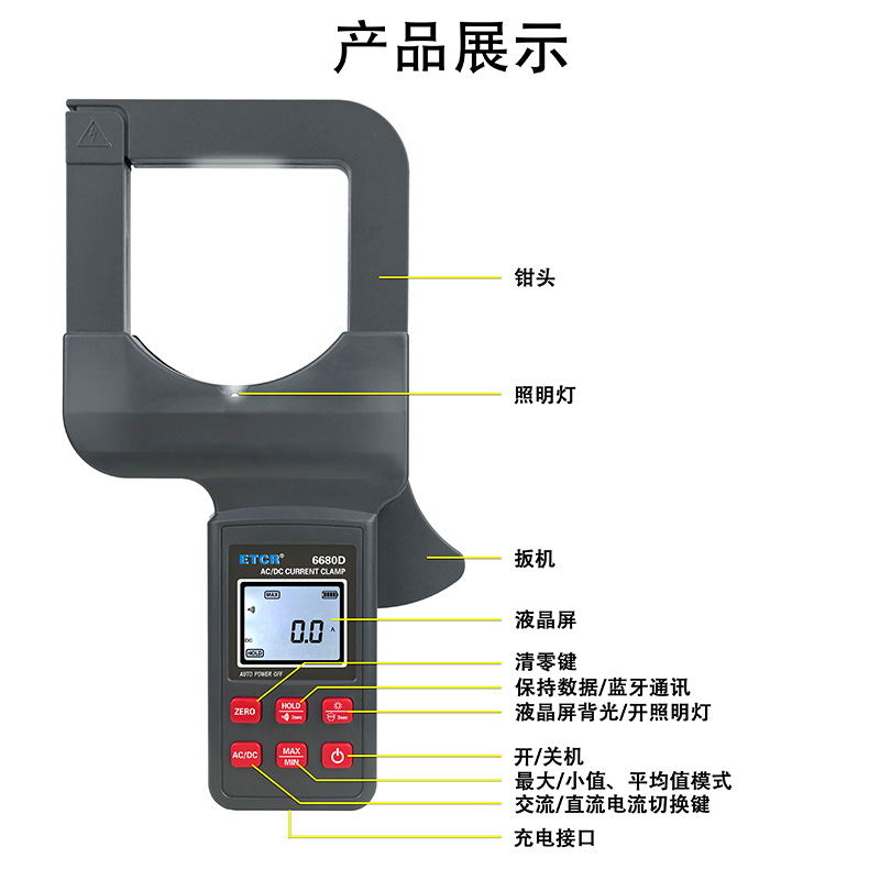 ETCR6680D大口徑直流/交流鉗形電流表鉗表具有直流/交流真有效值測量、最大值/最小值/平均值測量等功能。鉗表具有數(shù)據(jù)保持、藍牙通訊功能,使用大容量鋰電池type-c充電口,是一款新型的電工安全檢測必備工具。