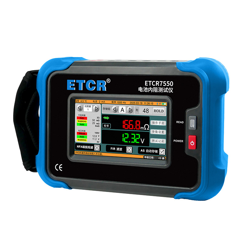 ETCR7550電池內(nèi)阻測試儀采用5寸觸摸彩屏,儀表高檔美觀,量程寬廣,分辨率高,操作便捷,攜帶方便,準確、可靠、性能穩(wěn)定,抗干擾能力強。是電池生產(chǎn)、電池安裝、設(shè)備生產(chǎn)、設(shè)備維修等場景必不可少的儀器。