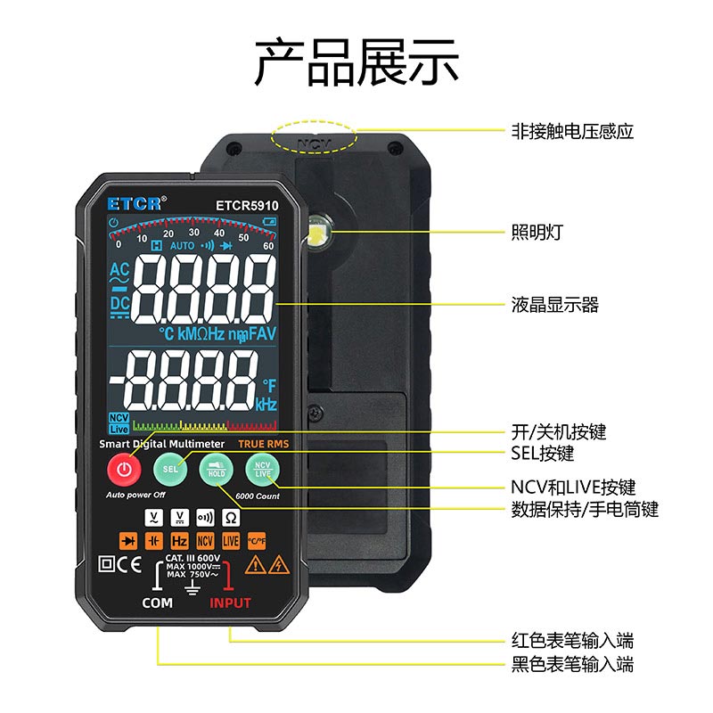 1. 便攜式6000計(jì)數(shù)自動量程數(shù)字多用表,全新設(shè)計(jì),結(jié)構(gòu)精巧、操作容易、攜帶方便,是電工電子測量之理想工具。
