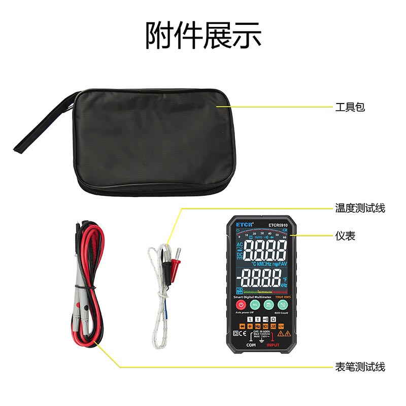 隨機(jī)附件 | 儀表:1件; 表筆:1付;溫度探頭:1條; LR03電池:2節(jié);工具包:1個(gè) |