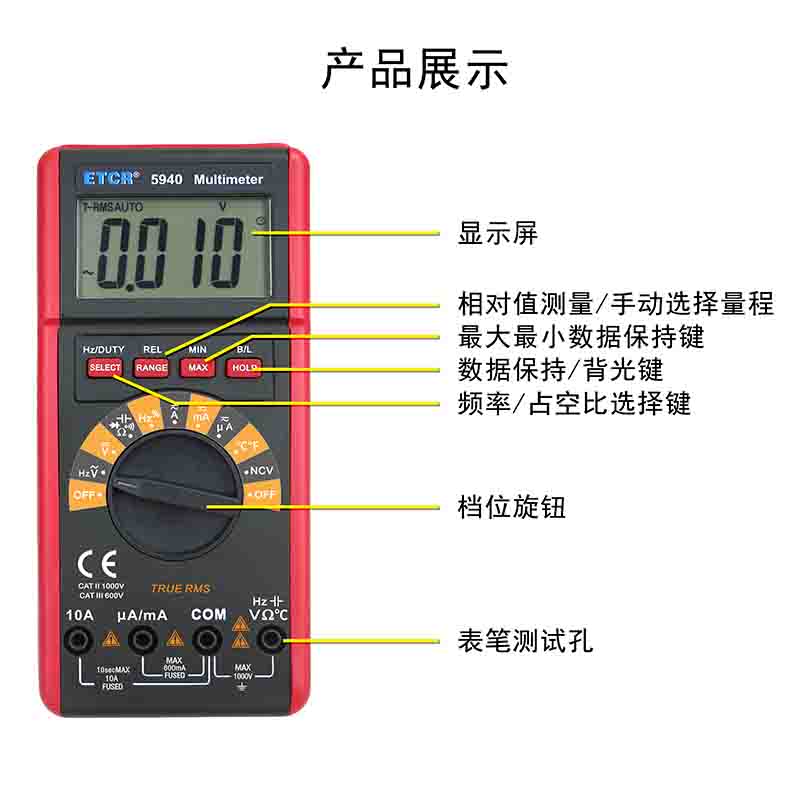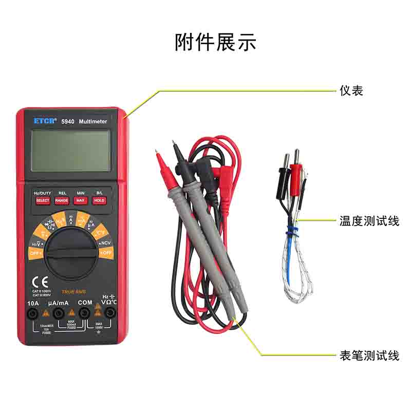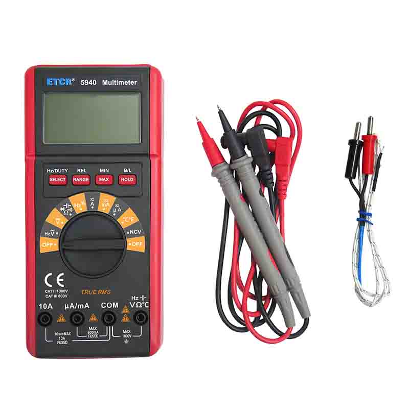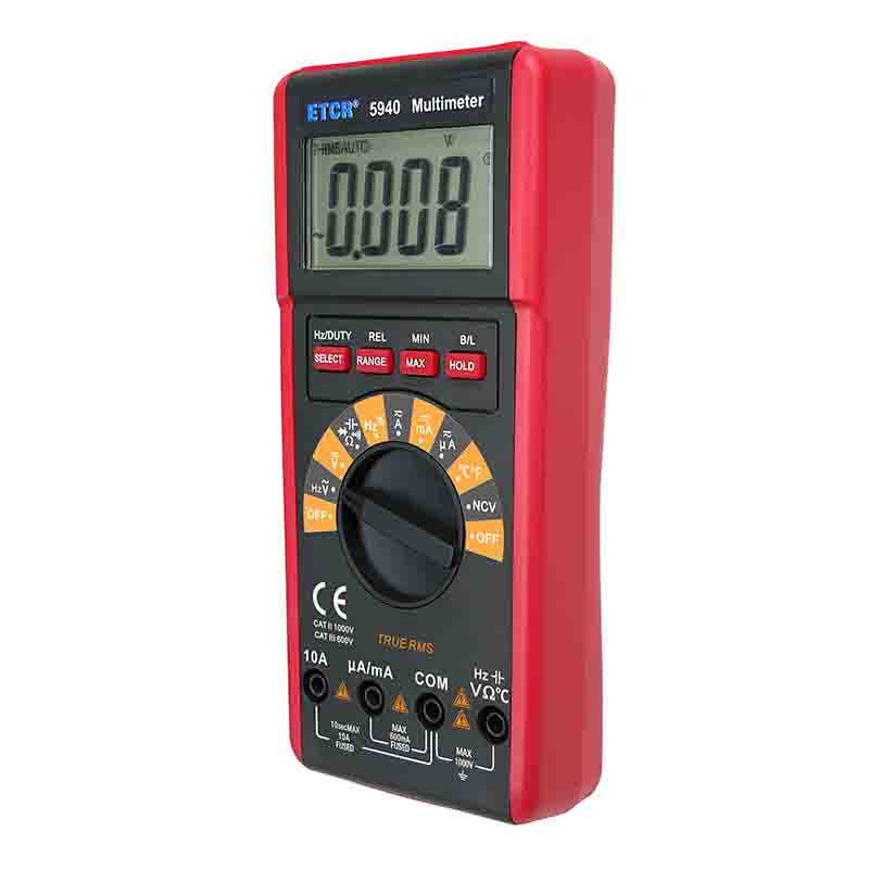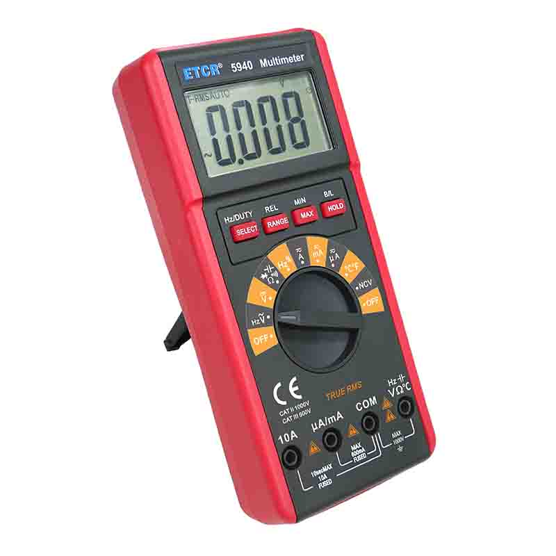 ETCR5940數(shù)字萬用表又稱數(shù)字萬能表、智能萬用表,是一款3 5/6位便攜式自動量程數(shù)字多用表,可測量交流電壓真有效值(TRMS)、直流電壓、交流電流真有效值(TRMS)、直流電流、電阻、頻率、溫度、電容、通斷測試、二極管正向壓降等。該儀表結構精巧、操作容易、攜帶方便,是電工電子測量之理想工具。