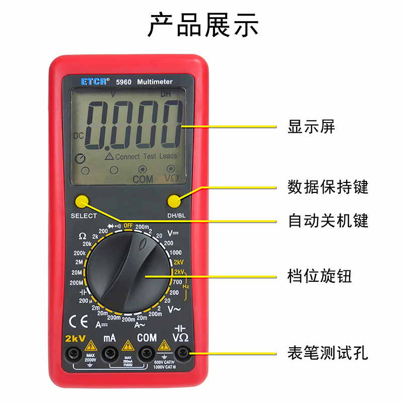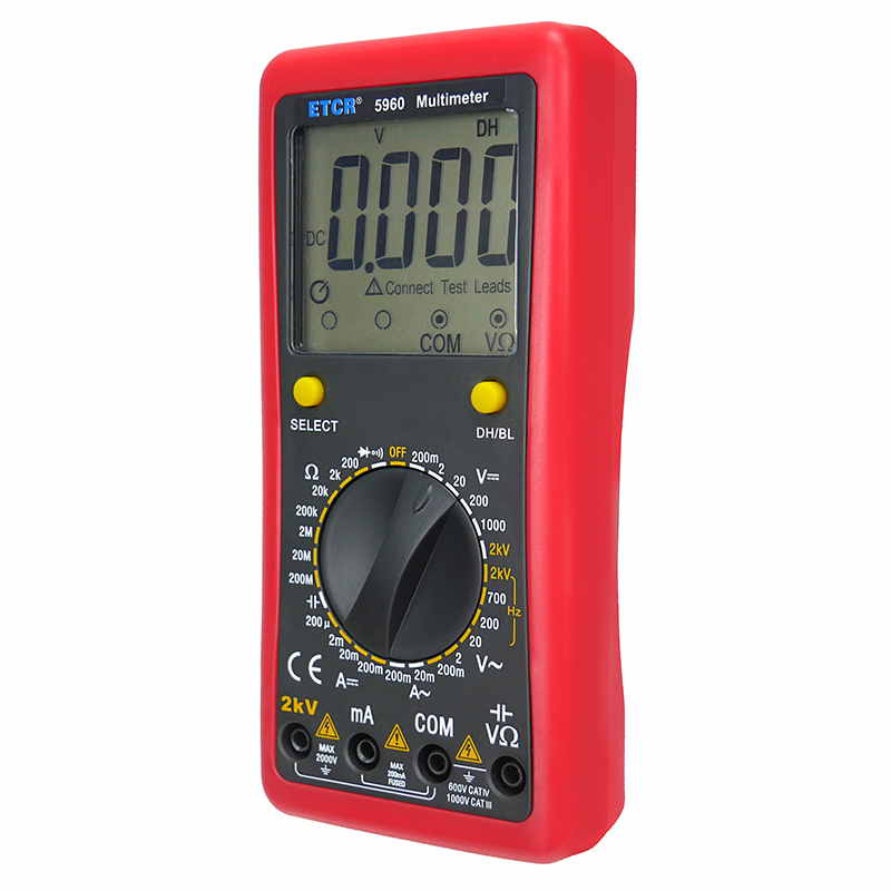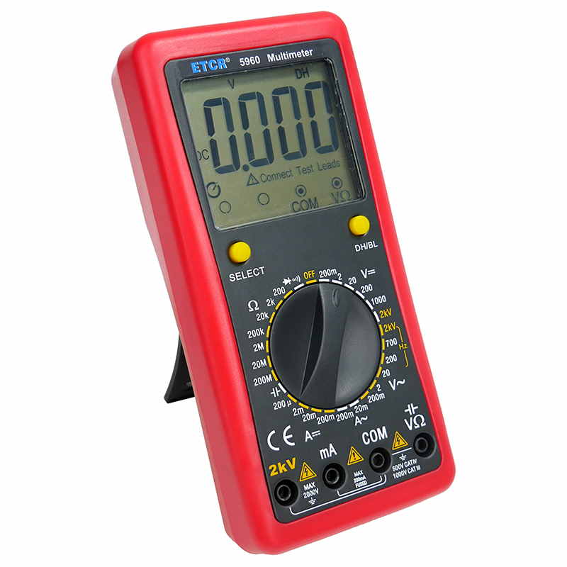 ETCR5960數字萬用表又稱數字萬能表、智能萬用表,是一種性能穩(wěn)定、用電池供電的高可靠性數字萬用表,它用單片機管理,全功能有過載保護。儀表能顯示各檔表筆和插座應插的位置,提示您不要插錯位置。該儀表能測量直流電壓和電流、交流真有效值電壓和電流、電阻、電容、二極管正向壓降、電路通斷等。測量準確、性能穩(wěn)定、安全可靠,是您理想的測試維修工具!
