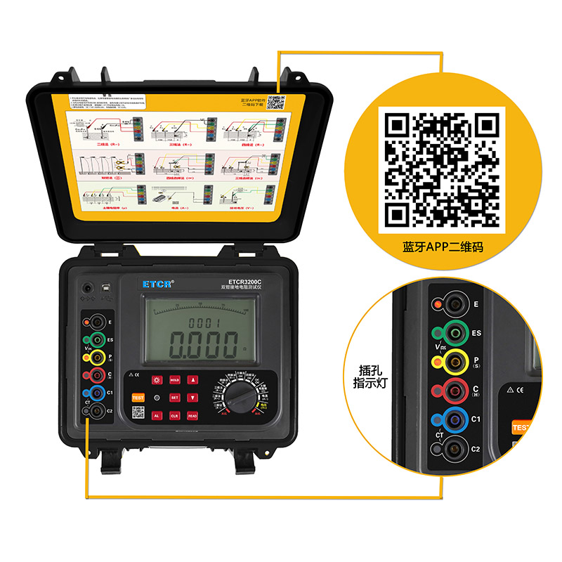ETCR3200C雙鉗多功能接地電阻測試儀由主機(jī)、電流鉗(雙鉗)、測試線、輔助接地棒、通訊軟件、通訊線等組成。主機(jī)超大LCD顯示,具有背光、棒圖指示,一目了然。儀表具有存儲功能,時鐘功能,自動存儲含有時間的測試結(jié)果2000組。儀表具有支持安卓系統(tǒng)的藍(lán)牙通信功能,安裝APP后可在移動終端進(jìn)行測試或讀取測試記錄,給你帶來全新體驗。儀表具有USB通信,存儲數(shù)據(jù)通過USB接口上傳PC機(jī),通訊軟件可以實現(xiàn)歷史記錄數(shù)據(jù)讀取、查閱、保存、報表、打印等功能。儀表廣泛應(yīng)用于電力、電信、氣象、油田、建筑、防雷及工業(yè)電氣設(shè)備等行業(yè)。