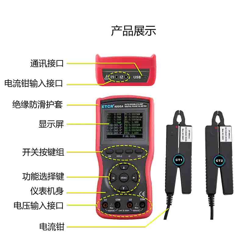 | ETCR4000數(shù)字雙鉗相位伏安表 | Φ8mm | 0~360° | 0.00V~600V | 0.00A~20.0A | -- |