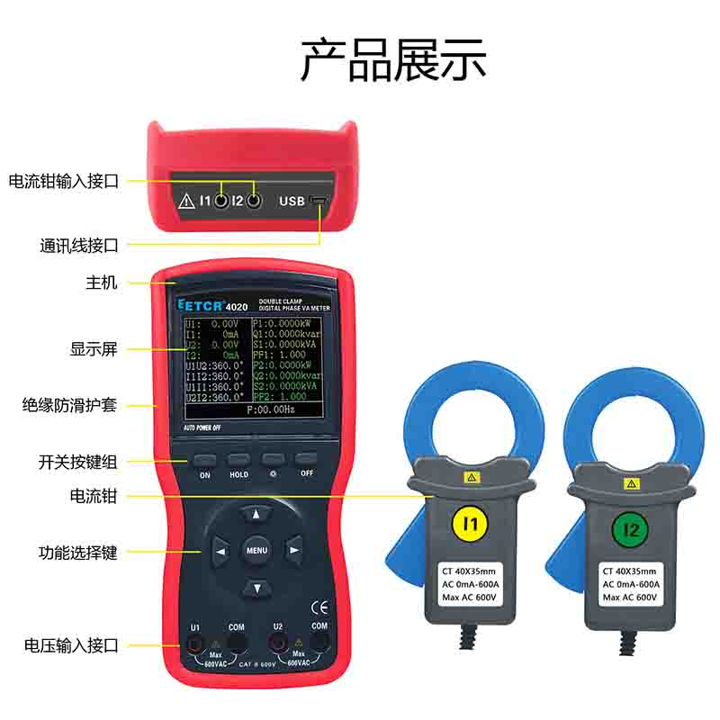 | ETCR4000數(shù)字雙鉗相位伏安表 | Φ8mm | 0~360° | 0.00V~600V | 0.00A~20.0A | -- |