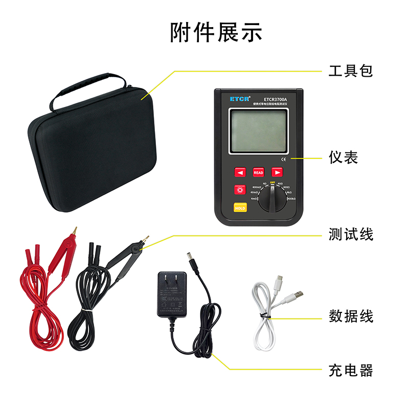 隨機附件 | 測試儀:1件;測試線:4條;USB通訊線:1條;專用充電器:1件;工具包:1件;表筆:2支 | |||