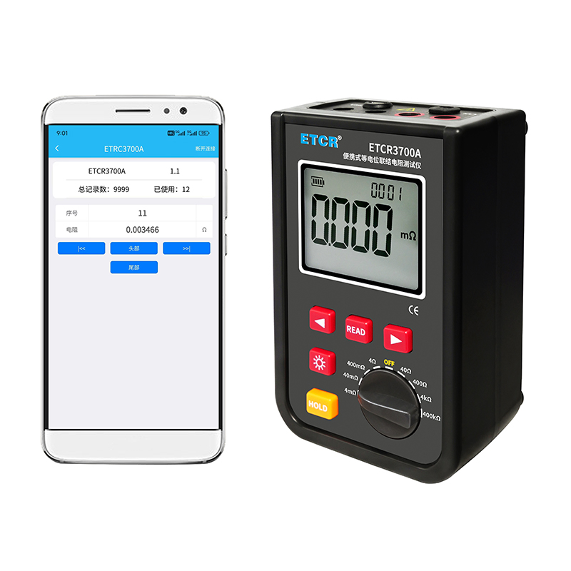 ETCR3700A等電位聯(lián)接電阻測試儀由主機、測試線組成。寬量程:0.001mΩ~400kΩ,高分辨率1uΩ,最大測試電流:1.2A,主機大屏LCD顯示,采用可充電大容量鋰電池,儀表具有自動關(guān)機功能,數(shù)據(jù)存儲功能,存儲測試數(shù)據(jù)9999組,具有藍牙通訊,安裝APP后可在手機查看測試記錄,具有USB接口,安裝上位機軟件后,可將測試數(shù)據(jù)下載電腦進行保存、管理、查詢、分析、打印等,儀表操作簡易,攜帶方便。