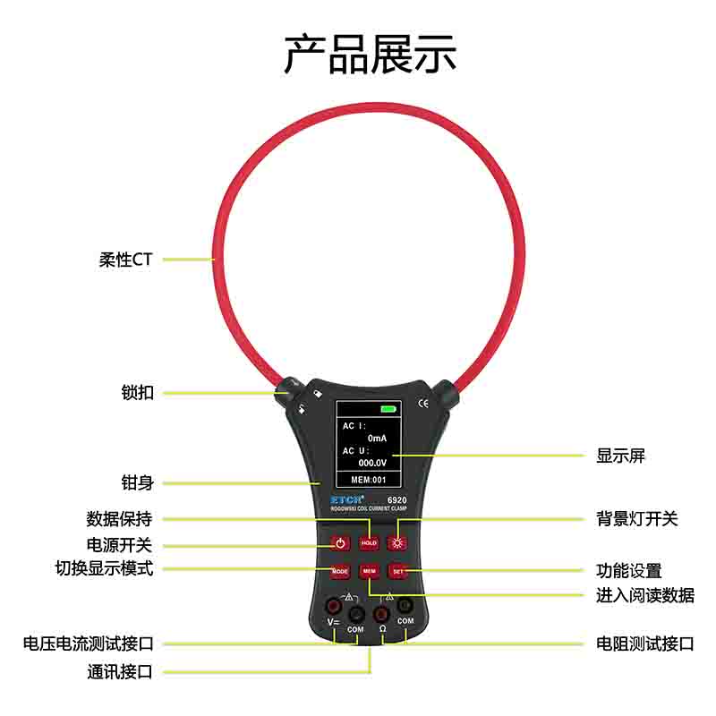 ETCR6920柔性電流鉗表又名柔性線圈鉗表、超大電流鉗表、羅氏線圈電流鉗表、洛氏線圈電流鉗表,用于交流電流測試、電壓測試、電阻測試、通斷測試。柔性線圈無任何裸露金屬導體,體積小、重量輕、柔軟靈活,特別適合大尺寸導體、狹窄環(huán)境和排線密集的場所,可用于信號嚴重畸變的工業(yè)環(huán)境電流測試。廣泛適用于電力、通信、氣象、鐵路、油田、建筑、計量、科研教學單位、工礦企業(yè)等領(lǐng)域。