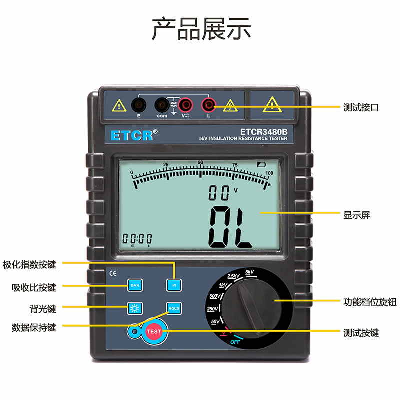 ETCR3480B絕緣電阻表又名兆歐表、絕緣電阻測(cè)試儀,用于絕緣電阻測(cè)試、吸收比、極化指數(shù)測(cè)試、交直流電壓測(cè)試。儀表具有LCD大屏幕帶背光顯示、數(shù)據(jù)保持、自動(dòng)放電、自動(dòng)關(guān)機(jī)等功能。儀表具有測(cè)試計(jì)時(shí),電壓監(jiān)測(cè)功能,回路電壓大于36V時(shí),儀表將禁止測(cè)試以保護(hù)被測(cè)物及人員安全。儀表功能操作簡易,絕緣電阻值,測(cè)試時(shí)間,輸出電壓同屏顯示,具備交流電壓、直流電壓測(cè)試功能。