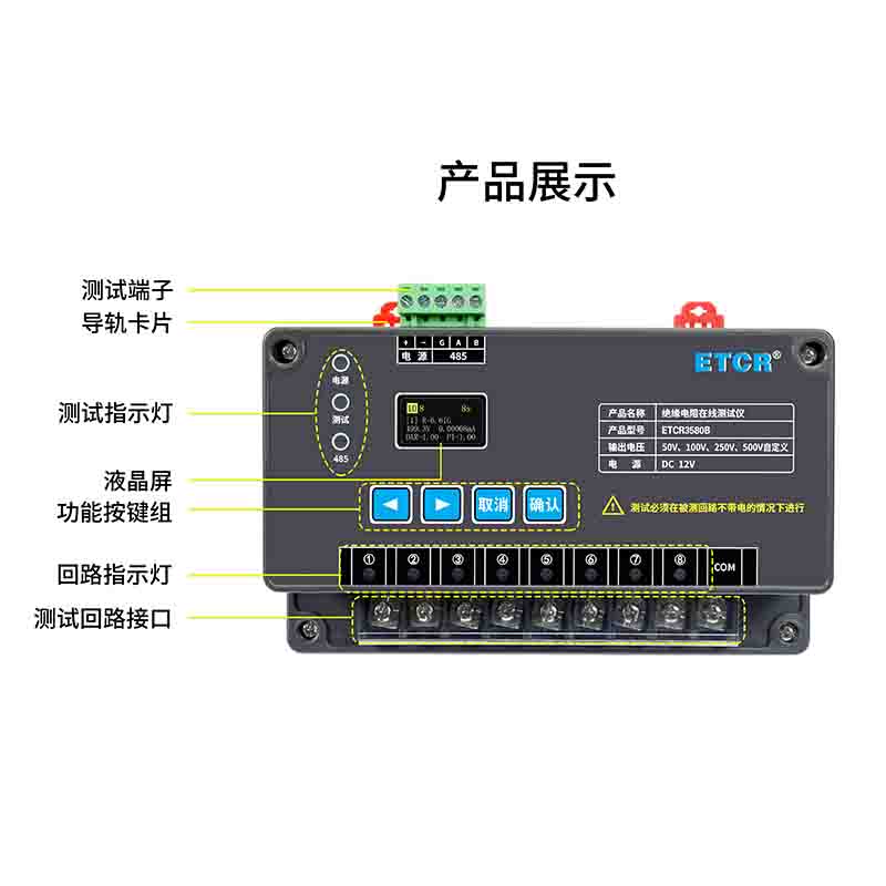 ETCR3580B絕緣電阻在線監(jiān)測儀又稱絕緣電阻在線測試儀,用于在線監(jiān)測電纜、電機(jī)、開關(guān)、電器等各種電器設(shè)備及絕緣材料的絕緣電阻值。監(jiān)測儀采用高清晰OLED液晶屏,測試參數(shù)可在儀器按鍵或后臺設(shè)置,安裝方便,測試可靠。監(jiān)測儀可監(jiān)測1~8個(gè)回路的絕緣電阻值,測試必須在被測回路不帶電的情況下進(jìn)行。