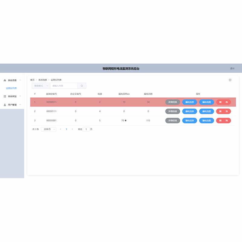 4、監(jiān)測儀管理功能:通過賬號來高效管理監(jiān)測儀,隨時更改簡要地址與安裝地點,使得每次監(jiān)測都能夠保證漏電事件發(fā)生時準(zhǔn)確的定位??刹榭吹劫~號所綁定的監(jiān)測儀臺數(shù),并自動歸類監(jiān)測儀類型,和該賬號最大綁定儀器數(shù)目等信息。