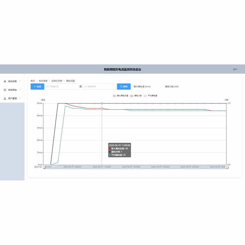 1、數(shù)據(jù)統(tǒng)計功能:系統(tǒng)對上傳數(shù)據(jù)進行統(tǒng)計,實現(xiàn)表格與折線圖兩種查看方式,實時監(jiān)測并顯示最大電流值與漏電次數(shù),便捷高效實用。在PC終端可通過時間按鍵快速查詢,該時間內(nèi)的所有監(jiān)測數(shù)據(jù)并以表格或折線圖兩種方式之一顯示出來。