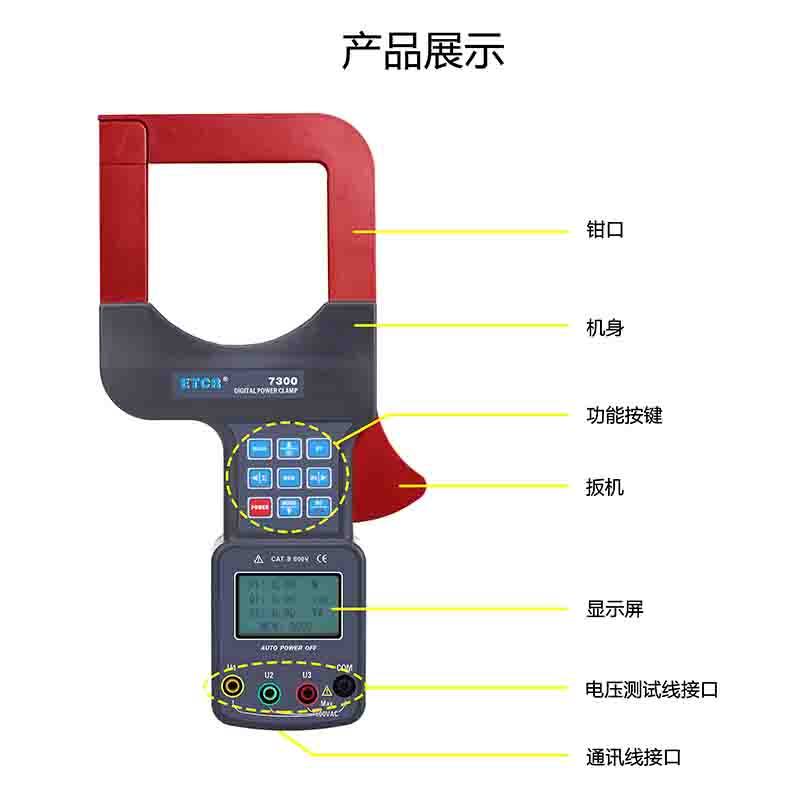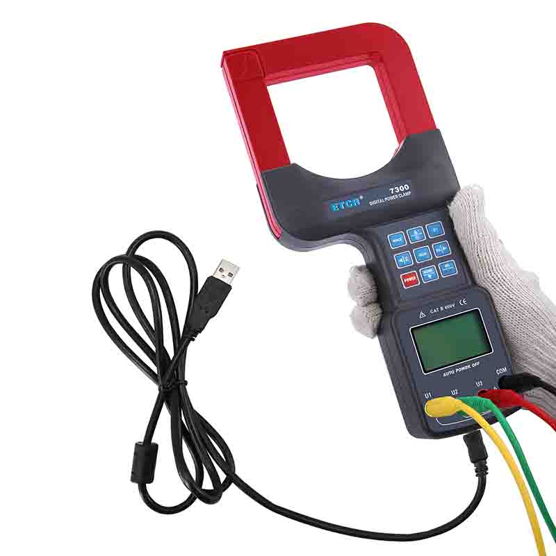 ETCR7300大口徑三相鉗形功率表又名鉗形功率計、超大口徑鉗形功率表、三相鉗形功率表,用于現(xiàn)場測量三相交流電壓、電流、漏電流、電壓間相位、電壓電流間相位、頻率、相序、電能、有功功率、無功功率、視在功率、功率因數(shù)、總功率等電能參數(shù)。還能用于判別變壓器接線組別、感性、容性電路,讀出差動保護(hù)各組CT之間的相位關(guān)系,檢查電度表的接線正確與否,檢修線路設(shè)備等,為用電檢查人員提供一種安全、準(zhǔn)確、便捷的新型電力儀表。