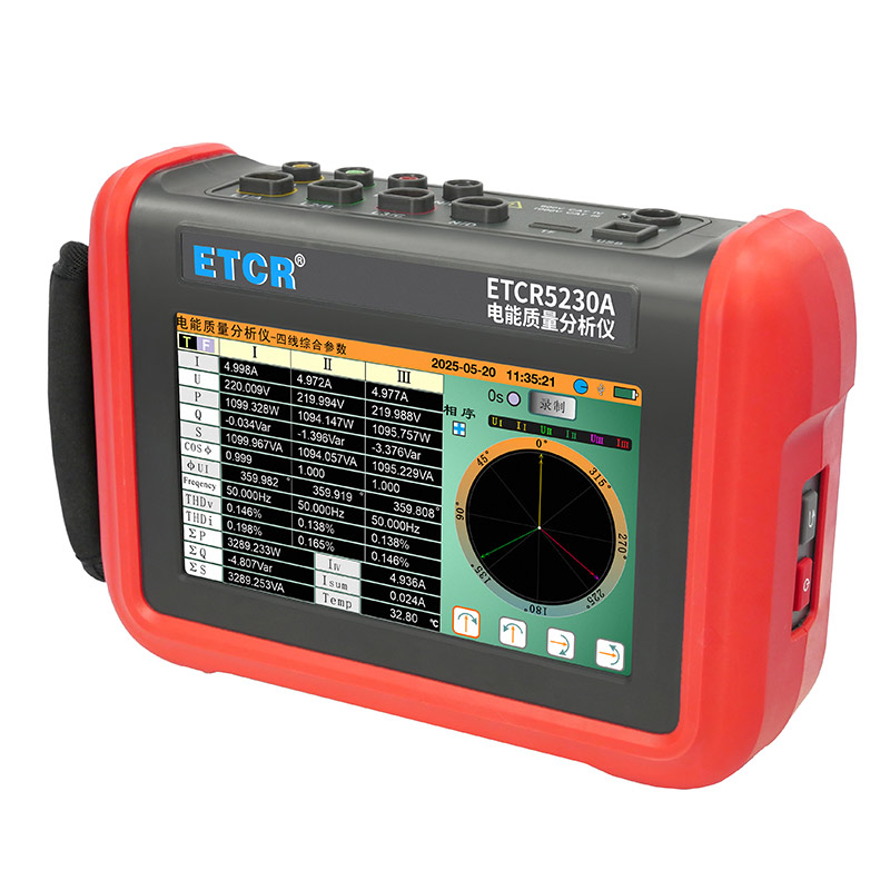 ETCR5230A電能質(zhì)量分析儀是我公司精心研制的一款專為現(xiàn)場測試三相電能質(zhì)量的高精度綜合型測試儀器。儀表具有智能化、功能完善、人機操作簡潔、中英文雙語操作界面等特點。儀表采用7寸觸摸彩屏、體積小重量輕、攜帶方便,可選配多款電流鉗。儀表可同時測量4路電流(ABC三相及中性線電流),3路電壓、三相不平衡度、有功功率、無功功率、視在功率、諧波比、總諧波失真度等;顯示電流電壓的實時波形、相量圖;動態(tài)捕捉電壓電流瞬時變化,監(jiān)測啟動電流,監(jiān)測各電力參數(shù)并生成告警列表,長時間記錄測試數(shù)據(jù)并生成趨勢曲線圖等功能。
