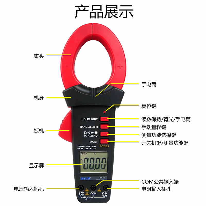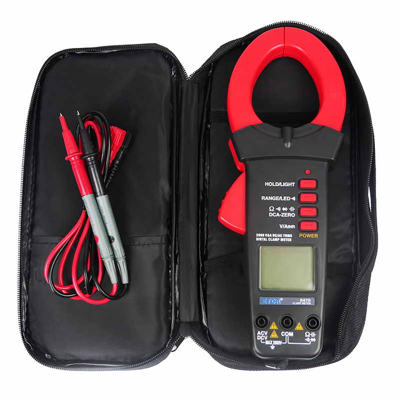 ETCR6470鉗形萬用表又稱多功能鉗形電流表,是一款能測量最大交直流2000V電壓和交流2000A電流的三位半便攜式數(shù)字鉗形表。它整機(jī)電路設(shè)計(jì)以新型專用MCU為核心,全功能有過載保護(hù),保護(hù)儀表不被燒壞。儀表采用按鍵式功能切換,具備高可靠性、高安全性、自動(dòng)量程等特點(diǎn)。具有大屏幕數(shù)字,數(shù)據(jù)保持、欠壓提示、自動(dòng)關(guān)機(jī)功能,真有效值測量能準(zhǔn)確測量變頻電壓,非正弦波電壓,浪涌電流能測量周期為80mS的浪涌電流有效值,適合測量大型電機(jī)、壓縮機(jī)啟動(dòng)電流。它可測量交流電流、交/直流電壓、電阻、電容、通斷測試、二極管正向壓降、LED工作電壓等參數(shù)。