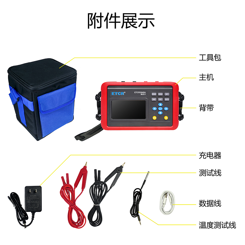 測(cè)試儀:1臺(tái);測(cè)試線:2條;溫度測(cè)試線:1條;USB通信線:1條;充電器:1個(gè);工具包:1件