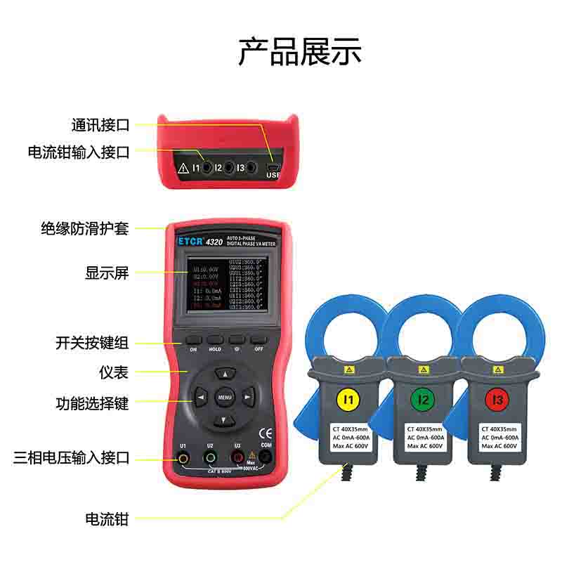 ETCR4300三相數(shù)字相位伏安表Φ8mm0~360°0.00V~600V0.0mA~20.0A0.0W~12kW--