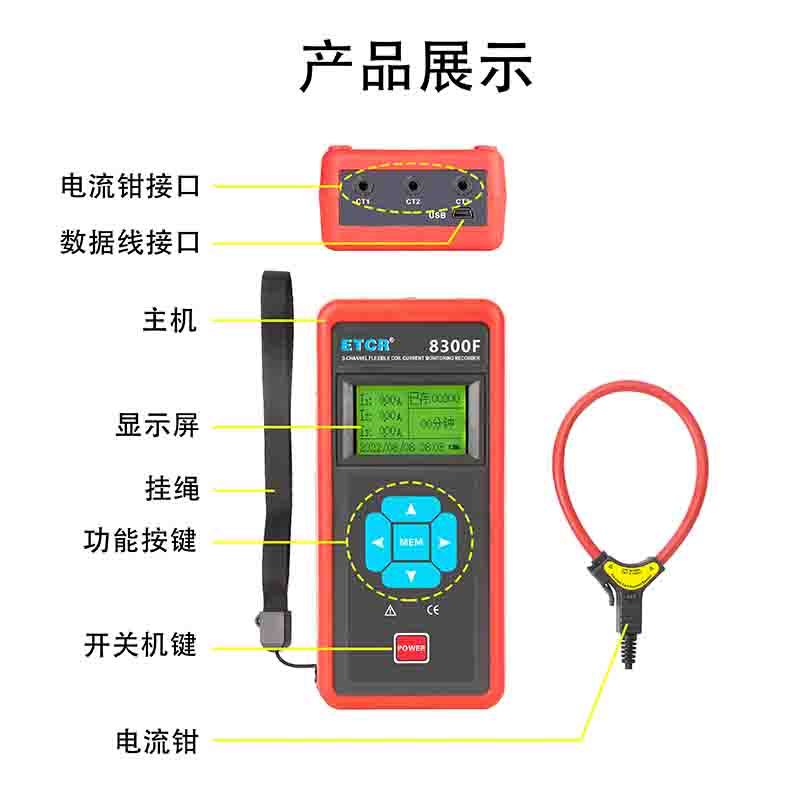 ETCR8300F三路柔性線圈電流記錄儀Φ200mmAC 0.00A~20.00kA7天1秒-99分鐘20萬組鋰電池