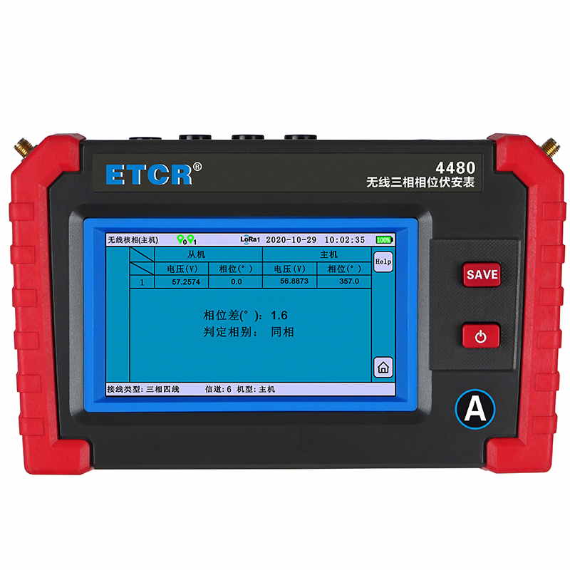 ETCR4480無(wú)線三相相位伏安表又稱三相電力參數(shù)測(cè)試儀、CT負(fù)荷測(cè)試儀、PT負(fù)荷測(cè)試儀,用于變電站內(nèi)不同位置的三相電力參數(shù)測(cè)量、PT無(wú)線核相、PT負(fù)荷測(cè)試、CT負(fù)荷測(cè)試、三相不平衡度測(cè)試、諧波分析等。儀表由2臺(tái)手持終端、6個(gè)電流鉗、2組電壓測(cè)試線等組成,2臺(tái)手持終端具有無(wú)線通訊及GPS通訊,可互設(shè)為主機(jī)或從機(jī),實(shí)現(xiàn)同步測(cè)量變電站內(nèi)不同位置之間電流、電壓、相位等參數(shù)。