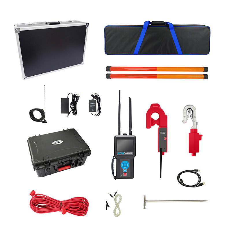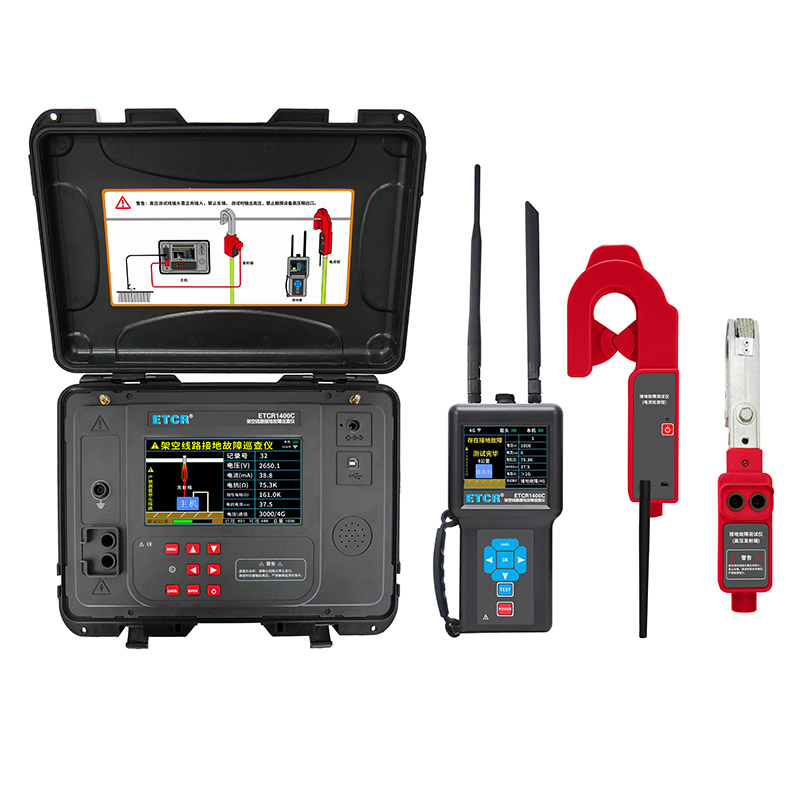 ETCR1400C架空線路接地故障巡查儀,由主機(jī)、電流檢測鉗、高壓發(fā)射端、接收機(jī)、測試線、接地針、絕緣桿及附件組成。主機(jī)與接收器之間為4G/LORA雙模通信,控制高壓信號輸出,同時將測試結(jié)果發(fā)出到主機(jī)。電流鉗與接收器之間為LORA通信,將電流鉗檢測到的信號發(fā)送到接收器。主機(jī)采用7寸彩屏,故障指向清晰明了,測試結(jié)果一目了然,接收機(jī)具有語音播報功能,測試結(jié)果、線路故障方向,使得現(xiàn)場操作更加輕松。電流檢測鉗及高壓發(fā)射端結(jié)構(gòu)緊湊,體積小,重量輕,掛裝方便,一次掛裝即可完成線路故障查找,操作簡易快速,極大減輕了測試的工作強(qiáng)度,提高工作效率。