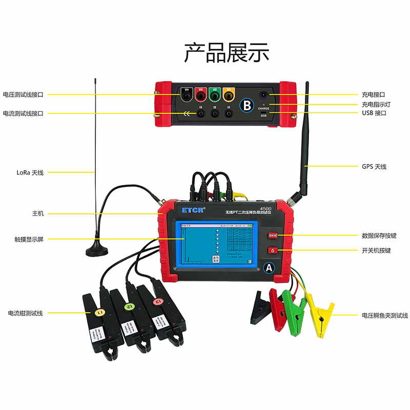 ETCR4500無線PT壓降負荷測試儀采用5寸觸摸彩屏、中文界面、功能直達、自動測量、操作簡易快捷,準(zhǔn)確可靠,儀表采用大容量可充電鋰電池、具有數(shù)據(jù)存儲、USB接口數(shù)據(jù)上傳導(dǎo)出等功能,儀表具有支持安卓系統(tǒng)的藍牙通訊,可在手機進行測試或查看測試記錄。本儀器采用專用計量芯片,具備非常高的電參數(shù)測量精度,能夠?qū)崟r顯示待測參數(shù)的變化,同時具備一鍵保存數(shù)據(jù)的功能。產(chǎn)品操作簡單、使用方便、測量快速、穩(wěn)定、結(jié)果可靠,是電力系統(tǒng)電能計量和繼電保護專業(yè),進行二次回路現(xiàn)場檢測的新一代儀表,也廣泛適用于電氣設(shè)備制造、石油化工、鋼鐵冶金、鐵路電氣化、科研教學(xué)等部門。